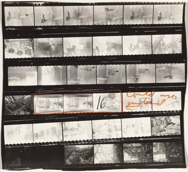 Editor: Here we have Robert Frank's contact print, "Flower festival--Spain 6," created in 1952. Looking at this series of images, it feels like I'm witnessing fragmented memories of a bygone era, each frame a fleeting glimpse. How do you interpret this work, especially within the context of post-war Europe? Curator: It's an intriguing compilation, isn't it? Beyond the surface of a "flower festival," Frank's work subtly reveals a more complex narrative. Think about Spain in 1952— still under Franco's dictatorship. What power dynamics do you observe or infer in the composition and content of the photos? Who is included? Who is excluded? Editor: I see some figures on horseback and what appears to be some type of celebration. The images also feel somewhat hazy and dreamlike, making it difficult to extract very specific ideas about power structures. I'm curious though, how Frank’s perspective as an outsider might have influenced these representations? Curator: Exactly. As a Swiss-American Jew, Frank possessed an outsider perspective. His lens challenges romanticized notions of national identity, doesn't it? He highlights the underlying tensions within celebratory spectacle, pointing towards unspoken hierarchies and controlled narratives. The somewhat obscured view invites the viewer to question what is being shown and what is intentionally hidden. Do you think this is a form of resistance? Editor: I didn't think of it as resistance at first, but now I think Frank may have been using his position as an outsider as a form of subtle critique by simply documenting what he was seeing. It encourages the viewer to analyze the scene more critically. Curator: Precisely! By inviting critical thought, the photography avoids explicitly stating a stance against Franco. It aligns with the cultural and intellectual resistance blooming at the time. This work embodies the idea that seeing can be an act of protest. Editor: I’ve never considered contact sheets as being part of a greater form of protest! Thanks for illuminating new perspectives about Frank’s choices, and, most importantly, the hidden narratives and subtleties that define his lens.