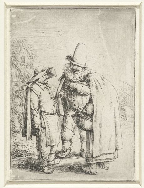 Adriaen van Ostade created this print, "Man with a pleated collar with a peasant couple," using etching techniques. The composition reveals a striking contrast in stature and attire that invites a closer look. Notice how the figures are arranged: the imposing man with the elaborate collar dominates the foreground, while the peasant couple is slightly behind. This positioning isn't just about placement; it's a visual cue about social hierarchy. The etcher’s fine lines capture the texture of fabrics, the weight of the cloak, and the rough appearance of the peasant's garments, all rendered in subtle gradations of tone. Ostade uses line and form to destabilize simple categorization. Are we to see in the contrast a critique, a celebration, or a detached observation of Dutch society? The tension between the figures leaves us questioning the very structure of representation and the codes by which we interpret social roles. This tension reflects the broader philosophical inquiries into representation and societal structure.