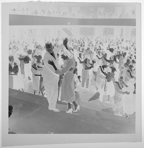 Curator: This is an untitled photograph by Jack Gould, currently held in the Harvard Art Museums. It shows men at a podium during what appears to be a political rally. Editor: It has such a ghostly quality, doesn’t it? Like peering into a memory, a faded echo of a moment thick with conviction. Curator: The photograph offers insight into mid-20th century American political culture. The composition, even in its inverted tones, suggests a carefully staged event. We can see "Truman for Vice President" signs in the crowd. Editor: There's a palpable sense of hope and ambition radiating from the figures, even in the negative space. But also a sense of performance, right? The raised hands, the flags... Curator: Exactly, these gestures are carefully constructed to inspire confidence and project authority within a very specific historical and social context. It speaks volumes about the ways political figures attempt to manufacture consent through spectacle. Editor: It makes you wonder about the stories hidden within the crowd, all those individual hopes pinned to a single moment in time. Curator: Absolutely. I find myself thinking about the exclusionary nature of that era's politics, who was included, and who was notably absent from these images of American power. Editor: Yes, the absences speak as loudly as the presences. Thank you, Jack Gould, for the haunting vision.