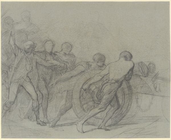 Wilhelm Trübner sketched "Eine Menschenmenge, die ein Theater stürmt" using graphite, presenting us with a raw, dynamic scene. The composition, dominated by vertical architectural elements, creates a stage-like space where the crowd surges forward. Trübner's use of line is particularly striking; hatching and scribbled lines build the forms of the figures, capturing a sense of movement and chaos. The absence of colour emphasizes the structural aspects of the drawing, inviting us to consider the relationships between form and content. The lack of detail and the sketch-like quality of the work expose the basic elements of representation. This approach to form destabilizes traditional expectations of finish and polish, and in this sense, Trübner challenges us to reconsider our understanding of how meaning is constructed through art. This piece is not just a depiction of a riotous scene, but an exploration of the very act of seeing and representing.