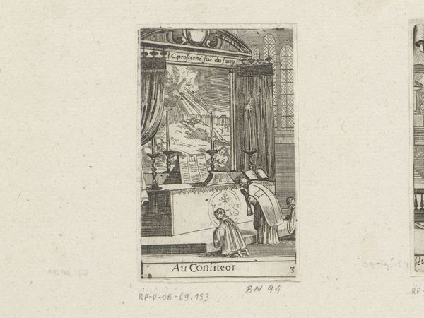 Editor: Here we have Sé́bastien Leclerc I's 1661 engraving, “Priester met hostie en twee misdienaars voor een altaar,” or “Priest with Host and Two Acolytes Before an Altar." It’s incredibly detailed despite its small size, but there's something solemn about the scene. What do you see in this piece that I might be missing? Curator: What I find particularly striking is how Leclerc uses this intimate religious scene to engage with broader socio-political themes prevalent in 17th-century Europe. The priest's ritual is not just a moment of personal piety, but a performance of power within a society deeply structured by religious institutions. Editor: Performance of power? Curator: Consider the setting—the altar, the vestments, the hierarchical arrangement of figures. All visually assert the Church's authority. Look also at the small image behind the priest, illustrating Christ being flagellated; it makes the connection of holy rite with persecution, reflecting contemporary power struggles. And, significantly, the dominance of the male figures in the sacred space and in Leclerc's print contributes to the ongoing narrative of gendered power dynamics. Editor: I see. It's more than just a depiction of a religious ceremony, it's about how religion was used as a tool. Curator: Exactly. The artist compels us to examine how such imagery reinforces existing social hierarchies and beliefs. The visual is an act of upholding dominant views in gender, politics and faith. It allows one to consider the cultural impact of religion on those of marginalized communities. Editor: This gives me so much to think about. I never considered how the visual space itself can be a statement of power. Curator: Art constantly converses with the context it was born in. I am now eager to find examples in art made after the Baroque period.