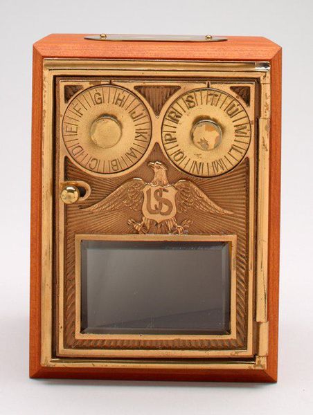 Editor: This intriguing artwork is a still bank shaped like a U.S. Post Office box, dating from around the 20th century. It's made of wood, a sort of rustic sculpture. There’s a weathered quality to it, like it has a story to tell. The combination lock on top looks so official. What catches your eye when you look at this? Curator: Oh, absolutely the layers! It's not just a box, is it? It’s a wink at bureaucracy and American ideals wrapped in a humble object. The eagle motif above the keyhole feels almost… ironic, juxtaposed with its function as a piggy bank. A symbol of freedom guarding our pennies. You know? A cultural artifact which reminds me of simpler times, almost a bit naive, but full of heartfelt ideals of safety. It makes you wonder, doesn't it? Was this meant to instill values, like saving and respecting the post office? Or was it subtly mocking these institutions? I’d like to see this contrasted against contemporary examples of how people now treat the postal service. Editor: That's a neat take. I was focused on the texture and assumed the Americana feel was all it had to offer. Now, considering the context, the symbolism feels a bit pointed. Curator: It invites speculation and personal narratives. And isn't that what good art should do? Give you some grist for thought? Editor: Totally! I'll definitely look at everyday objects differently now. Curator: It's the best kind of treasure hunt, isn't it? A reminder to notice the little ironies that shape our view of the world, with beauty being truly in the details.