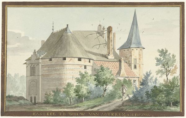 Curator: Welcome. Here we have Franciscus Andreas Milatz's "The Castle in Heemstede," rendered in watercolor and gouache around 1801. Editor: It has a faded, almost dreamlike quality. The overcast sky definitely sets a melancholic mood. Curator: Agreed. Notice the detail Milatz gives to the textures. You can almost feel the rough brick of the bridge and the aged stone of the castle itself. The material reality is almost palpable. It draws your eye to the bridge itself, connecting to daily labor in brickmaking. Editor: The towers! Aren’t they magnificent? They project a certain power. Castles often carry a symbolic weight related to power, security, and even fairytale magic, don't you think? Curator: Perhaps, but I am drawn to consider the consumption inherent here. This picturesque view, a moment of leisure for those figures in the foreground, enabled by the very systems of labor from which this castle arose. Consider the pigment used—the trade networks that had to exist. Editor: True, but it is impossible to ignore the symbolism. The architecture reaches skyward. And water in art, it evokes cleansing and rebirth. Curator: Speaking of the figures, let's look at their attire. This style, this arrangement of family and solitary figure – these represent economic divisions during that era. They stand as signifiers. Editor: You may be right about that social reading. Still, I feel the deeper meaning is that tension between human ambition and nature's embrace. Look at how the trees frame this very symbol of power. The slow creeping in of natural processes reclaims the work of man over time. Curator: Indeed. Through meticulous artistry, the painting reflects complex interplay between materiality, manufacturing, and society. The economic networks become almost visible through close examination. Editor: Ultimately, I’m left contemplating cycles of creation and dissolution, both personal and historical. Symbols speak beyond time. Curator: And I am left reflecting on the systems that leave their indelible marks upon artistic output. Thank you for this new vision!