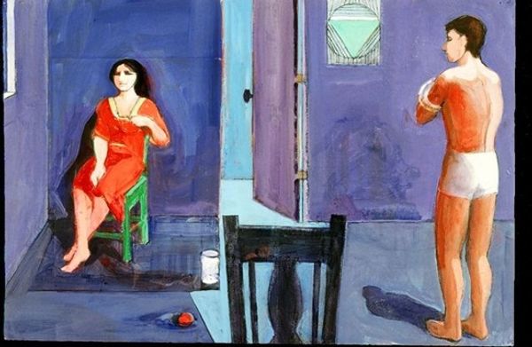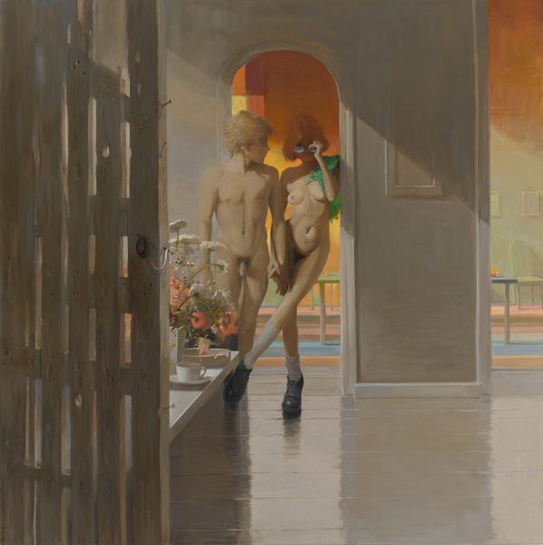 Curator: This is Vincent Giarrano's painting, "In Soho." He primarily works with acrylic paint, favoring themes of figuration and cityscapes in his modern realist style. What's your first take on it? Editor: It's so…still. Like a little pause button has been pressed on the city's usual chaos. Makes you wonder what's going on behind all those storefronts. Curator: The painting's composition directs us, through its linear perspective, to specific points. Observe how Giarrano manipulates the architectural structure, using the building's columns and storefronts to frame the subjects. Editor: Yeah, and that fire hydrant, that pop of red and green, seems like it's screaming, "Notice me!" amid all those blues and whites. Maybe it’s a little visual joke, you know? Like, even a functional thing has its own vibrancy in the city's stage. Curator: Precisely. The tension created by the woman absorbed in her phone juxtaposed against the dynamic energy implied by the cityscape behind her contributes to the painting's semiotic narrative, suggesting urban isolation amidst communal space. Editor: The woman on her phone, the one in the back walking by…both are minding their own business, totally separate from one another, yet completely linked by the shared location, that street. They both have separate realities unfolding within feet of one another. Curator: His use of light, too. See how the lighting effects are rendered realistically yet selectively, accentuating certain architectural and figural details over others, emphasizing both texture and depth? Editor: You get the feeling the artist sees all this and finds it incredibly fascinating, too. Like, what are we even doing in these places, really? The painting’s got that sense of bemused, slightly detached observation, like he's an anthropologist of the everyday. Curator: Indeed, a compelling visual study. We witness an intersection between representational realism and an introspective portrayal of contemporary urban life. Editor: Agreed. There is more here than just a snapshot of a street, I feel. I get a vibe of both disconnect and this odd collective belonging, woven into the urban tapestry. Curator: It provides, then, an apt synthesis of reality and perception within the socio-geographic limits of modern city life. Editor: I guess you can stare at this stuff forever. Finding all these strange threads that weave it all together. Thanks for walking me through that!