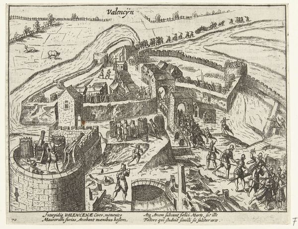 Curator: The precision in this engraving, “Inname van Hoei, 1595,” made anonymously around 1613-1615, is immediately striking. It captures an event in minute detail. Editor: My first impression is a kind of stark dynamism. The busy-ness of the landscape contrasts the harsh realities suggested by this chaotic siege scene, particularly concerning materiality in this baroque style artwork. Curator: Absolutely, the use of line creates both texture and depth. Look how the engraver articulates the hilly terrain, drawing your eye toward the fortress atop the hill. Notice the perspective employed; the landscape dominates yet frames the city and active siege. Editor: And how labor-intensive this must have been! Consider the skilled hand that meticulously rendered each individual figure, each brick of the fortifications. This isn't just image-making; it's the physical labor of creating a narrative, a propagandistic piece for that matter. The print-making production likely amplified and distributed a very specific socio-political point-of-view for the city of the time. Curator: The textual components also add to the narrative, doesn’t it? The work creates a dialogue between the visual elements and the literary components. In addition, look at how the light reflects of off the waters surface using hatching. It’s also symbolic for a society which was dependent upon its waterways as sources for trade, survival, and connectivity. Editor: I'm drawn to consider how the circulation of such prints impacts perceptions of the landscape itself. The depicted landscape transforms, commodifies it, almost reducing it to an object of conquest and ownership, ready for consumption. Curator: An interesting lens through which to consider it! For me, analyzing how space is represented creates meaning in itself. Thank you for your perspective, I will contemplate the social dimension behind these printed images from now on. Editor: And I shall add formal investigation to my repertoire, particularly for unpacking symbolic layers of such landscapes.
