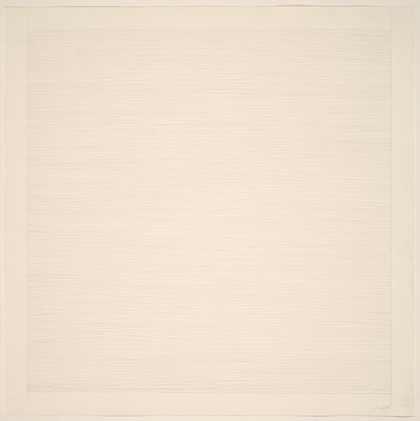 Editor: Right now, we're looking at "The Desert" by Agnes Martin, created in 1965. It looks like acrylic and graphite on canvas. My first thought is of its incredible subtlety; the color is so muted and it almost fades into the background. What do you see in this piece, beyond just a minimalist grid? Curator: It’s interesting that you call it "muted." I think the desert itself is not muted, but radiant – it reflects a constant negotiation with power structures and visibility. What appears as simple abstraction in Martin’s work is, in my opinion, a profound comment on the social and political environment of its time, especially considering gender roles in the art world. Editor: Gender roles? That’s an interesting take. Can you elaborate? Curator: Martin’s departure from the dominating abstract expressionist movement was indeed significant. Dominated by male artists and grand gestures, her turn toward quiet, introspective grids can be interpreted as a silent rebellion. Can’t it also be understood as a subversion of power in favour of the experience of those traditionally ignored in favour of men's experiences? Editor: So, you're saying that the apparent simplicity actually speaks volumes about challenging male-dominated art scenes? Curator: Exactly! Minimalism, in this context, shifts from mere aesthetics to a powerful declaration of independence, even resistance. The desert, usually considered barren, becomes a fertile ground for reconsidering how value is constructed and assigned within the art world. Editor: That's fascinating! I never considered the political context of minimalism this way. Curator: Art is rarely just about what's on the canvas, it reflects and challenges existing structures and power. Editor: I see "The Desert" in a new light now; it's much more provocative than I originally thought. Curator: Precisely. And it is vital we interpret it accordingly.