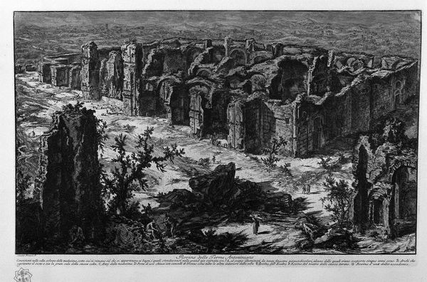 Curator: Piranesi’s etching, titled “View the remains of factories on the second floor of the Baths of Titus," really captures a melancholic atmosphere. What’s your initial impression? Editor: Stark. The remnants of these structures evoke such a palpable sense of history. But it's the material decay—the erosion of the stone, the vegetation reclaiming what was once built—that I find most arresting. What story do you see in the formal arrangement? Curator: Structurally, it is all about the power of perspective. Piranesi uses exaggerated depth to create a sense of the sublime, highlighting the contrast between the grandeur of the ruins and the small figures wandering amongst them. This juxtaposition amplifies the overwhelming scale of history, doesn’t it? Editor: Absolutely, but I see that relationship between the workers and the scale of the structures somewhat differently. Looking at the foreground rubble and the way nature intertwines with these remnants of past labor, I am struck by questions. What raw materials went into its making? How were they transported, who were the laborers? These structures tell tales of extraction, human toil, and the transformation of resources. Curator: An interesting reading. I am still drawn to the architectural articulation itself. Consider the artist’s rendering of light and shadow – the chiaroscuro, that emphasizes the solidity of forms, their geometry, against the more amorphous natural elements. This creates tension, but also unity in the composition. Editor: Precisely. This complex, layered process, going from the original quarried materials to the Roman architecture, transformed again into manufacturing sites, only to return to a state of natural decomposition, shows so many cycles of repurposing. It urges me to reflect on human innovation, social structure, and our impact on the world we live in. Curator: Your view invites an entirely new reading for me. Ultimately, Piranesi captures the power of architecture as an articulation of civilization in dialogue with inevitable decline. Editor: And for me, it becomes a mirror to reflect upon not just grand structures, but the intricate details of human endeavor and the world around us.
