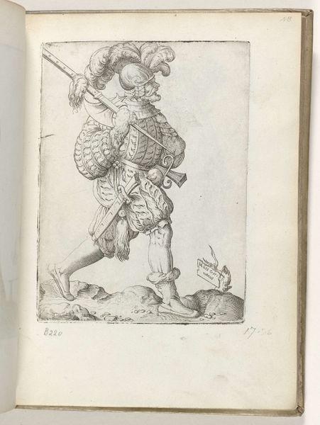 Enea Vico created this engraving, titled "Cursor Germanus," in the mid-16th century. This print, now residing at the Rijksmuseum, offers a fascinating glimpse into the cultural perceptions of German identity during the Renaissance. Vico presents us with a messenger, a "Cursor," adorned with the attire and accoutrements associated with German lands. The image creates meaning through visual codes: consider the figure's fur hat, decorated cape, and the prominent dagger, all signifiers of a specific cultural identity. It was a time when regional stereotypes and cultural distinctions were being solidified in the European imagination. As historians, we can delve into period costume books, travelogues, and other printed sources to further understand the social conditions and biases that shaped this representation. By examining these resources, we can start to unpack the complex interplay between artistic expression, cultural identity, and the politics of imagery in 16th century Europe.