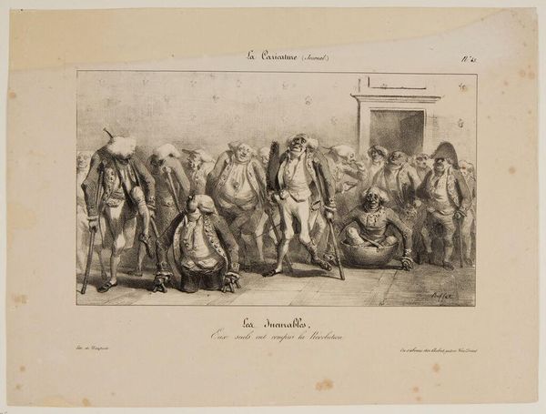 Curator: Auguste Raffet, born in 1804, created this print titled "The Archbishop Has Always Been a Joker," now residing at the Harvard Art Museums. Editor: Oh, wow, what a lively scene! There's such an exuberance and chaotic energy to it. A real sense of mischievousness, wouldn't you say? Curator: Absolutely. Lithography, the printmaking process, allowed for the mass production of such images. It's a commentary on power, poking fun at authority figures during a period of social upheaval. Editor: I love the way Raffet captures the tension in the room. One figure holds aloft what looks like undergarments—such a childish prank, yet full of rebellious spirit. Curator: Indeed. It’s a window into the material culture of the time—the uniforms, the discarded papers, the crowded room. Editor: The work invites you to imagine the stories behind the faces, the sounds of the commotion. Curator: It's more than just the artistry, but a record of the means and methods used to question established order. Editor: I find that the picture speaks to the rebel in me! Curator: It provides a fascinating glimpse into past socio-political dynamics.