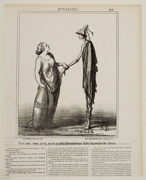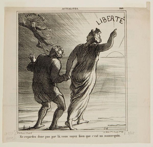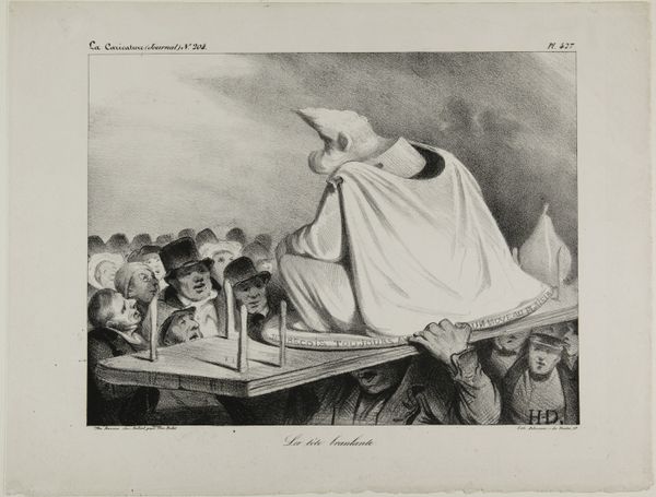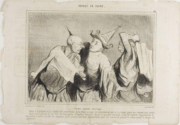 Editor: This is "Chinois Causant Politique" by Honoré Daumier. It's a really interesting lithograph depicting three figures in intense discussion. What's your take on the political commentary here? Curator: Daumier frequently used caricature to critique political and social issues. Here, he uses stereotypes about China to comment on the political discourse in France itself. The figures appear theatrical, almost absurd, suggesting the ridiculousness of political squabbles. Do you think this commentary is effective, given the imagery? Editor: It's definitely thought-provoking. The exaggerated features and chaotic composition make it hard to take the scene seriously. Curator: Exactly! Daumier highlights the performative aspect of political debate and the tendency toward heated arguments. The historical context shows the use of orientalism as a tool for critiquing one's own society. Editor: I see! So it's less about China, and more about France's own political climate reflected through this lens. Thanks!