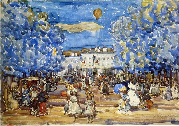 Editor: This is Maurice Prendergast's "Picnic," created around 1923. It seems to be a mixed media work on paper. There’s a vibrant, almost dreamy quality to the scene; people scattered, enjoying the day, rendered in soft washes of color. It makes me feel like I’m looking at a hazy memory of summer. What stands out to you? Curator: It does shimmer, doesn’t it? For me, it’s the dance between observation and invention. Prendergast captures the light and feeling of a leisurely gathering, yet he abstracts the figures and landscape into these wonderful mosaics of color. It's like he's distilled the very essence of a perfect summer afternoon. The way he balances those washes of watercolor with bolder, almost scribbled lines gives it a sense of immediacy, as if he were sketching the scene in real-time, caught up in the joyous moment himself. Does it remind you of any particular time or place? Editor: I can definitely see the immediacy you’re talking about. I guess, thinking about it now, the figures become almost secondary to the overall feeling of warmth and light. I'm not usually drawn to Impressionism, but this really has that "vibe." So, what do you think he was trying to express with this piece? Is it as simple as capturing a nice day? Curator: "Simple," maybe not. But honest? Absolutely. It’s easy to get lost in the prettiness of it all, but beneath the surface, Prendergast is also hinting at the fleeting nature of these moments. It’s the type of scene you know can’t be captured again, you know? The sun, the light, the people, all unique, gone with the next breath. Editor: That makes total sense, actually. I was just looking at the upper right area; that chaotic scumble of pencil really shows that ephemerality now that you've pointed it out. Curator: Yes! He's a master of suggestion, isn't he? This little work, in its own way, is really about how a picture, a moment, never remains the same; its value shifts with the passage of time and memory. A really special little treasure, I'd say. Editor: Wow, I definitely look at it differently now. Thanks for the insight!