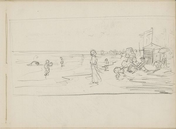 Johan Antonie de Jonge made this drawing of figures at the beach. It’s all done with colored pencils on paper; the marks are clear, and the process is right there for us to see. Look at how the blue and grey pencils work to create the sea and sky, with horizontal lines suggesting the movement of the water and the vastness of the sky. Then, there's this pop of red on the child's swimsuit, a focal point amidst the muted tones. I'm drawn to the way the figures are rendered with such simplicity. There is a series of lines that create an ephemeral and fleeting impression. The texture of the paper remains visible, adding to the sketch-like quality. It’s not about perfection; it’s about capturing a moment, an impression. It reminds me a bit of some of Vuillard’s more intimate sketches, where the everyday becomes extraordinary through the artist's gaze. Art is always speaking to art, an ongoing conversation. It is about possibilities, not prescriptions.