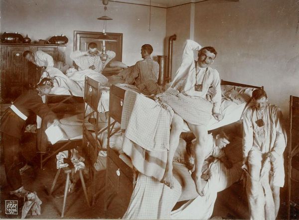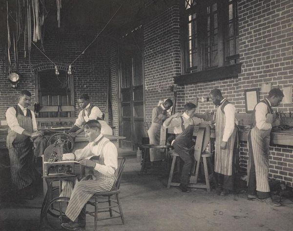 Editor: This photograph by Frances Benjamin Johnston, titled "Plastering," shows three men at work. It evokes a sense of quiet industry. What symbols do you see in this image? Curator: The plaster itself is a potent symbol of building, of construction – not just of walls, but of lives and futures. These men, through their skilled labor, participate in a larger narrative of progress and assimilation. Notice how their focused expressions echo the hope for economic and social mobility. Editor: So, the act of plastering represents more than just construction? Curator: Exactly. The image subtly points to the Hampton Institute's mission: vocational training as a pathway to empowerment, while also touching on the complexities inherent in the concept of "assimilation." What does it mean to build a new identity on old foundations? Editor: That gives me a lot to think about. The layers of meaning here are truly fascinating.