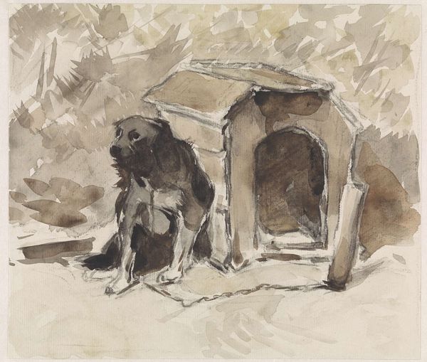 Curator: This watercolor on paper, attributed to Walter Shirlaw and titled "Rothenberg", transports us to a quiet, perhaps romanticized, 19th-century European village scene. Editor: My first impression is that it feels fleeting, like a memory fading at the edges. The palette is subdued, and there's a softness in the rendering that suggests transience. Curator: Indeed. Shirlaw was deeply influenced by his time in Munich, absorbing the artistic approaches favored at the academy there, including plein-air sketching. Consider this work within the context of American artists seeking training abroad to later inject European styles into American art institutions. Editor: Looking at the structure, the eye is drawn upward by a fairly strong diagonal, starting with the ducks in the foreground and tracing the rooftops above, yet it also feels incredibly flat—something accentuated by the use of watercolor. Curator: Observe the scene: a rustic building, perhaps an inn, draped with vines. The presence of the chickens and ducks grounds the image in the everyday life of a rural community, speaking to shifting representations of labor and leisure at this time. Editor: It is interesting how the window and what appears to be a blocked doorway create this visual puzzle. Is this simply a transcription of observed forms or an interest in something else, a subtle study of textures perhaps? Curator: Shirlaw straddled the line between academic tradition and burgeoning modernism. This drawing reflects his commitment to capturing the visual truths of his subjects. It offers a sanitized vision of rural life in post-industrial Europe. Note also, that at the time this piece was completed there was a fascination in the United States for German architecture, landscape, and art. Editor: Ultimately, it’s the interplay of light and shadow that intrigues me most—how the washes of color define form and evoke such a tangible sense of atmosphere. Curator: For me, "Rothenberg" is a document of Shirlaw's artistic journey, reflecting a moment where American artistic identity was actively being shaped through interactions with European art, education and philosophy. Editor: A moment perfectly encapsulated in this gentle dance between realism and fleeting impression.