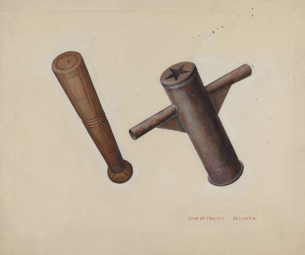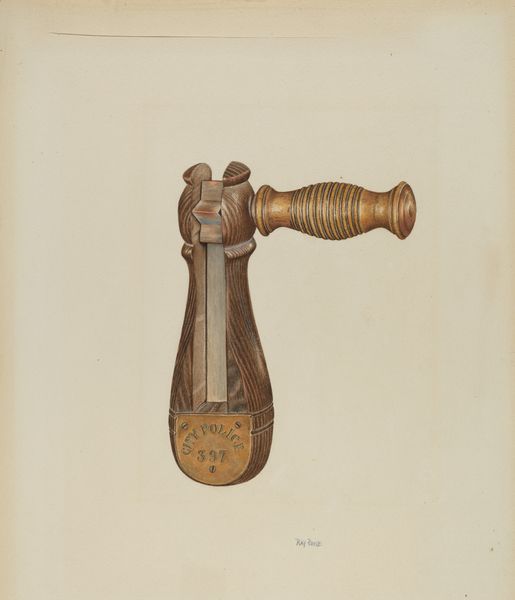 This is Samuel Fineman's rendering of a Police Rattle, made in 1967 with graphite and watercolor on paper. Fineman wasn't trying to create an object here, but rather record it. This gives the artwork its particular power. The rattle itself would have been a crucial element of policing, a means of urgently summoning assistance. It’s made of simple wood, shaped for a handle, with a clapper spinning on a central pin. The sound it makes is shrill, and unmistakably insistent. You can imagine the hand of the officer holding it, and the urgency in the gesture of spinning the clapper. Fineman’s drawing brings all this to the fore. By depicting the rattle with such care, he asks us to consider the social context that gives the object its meaning. Ultimately, it's a tool of social order, of governance and control. The drawing makes you think not just about the thing itself, but how it figured in the world.