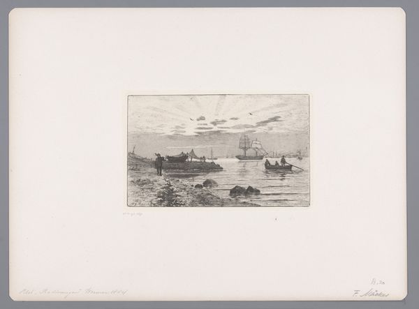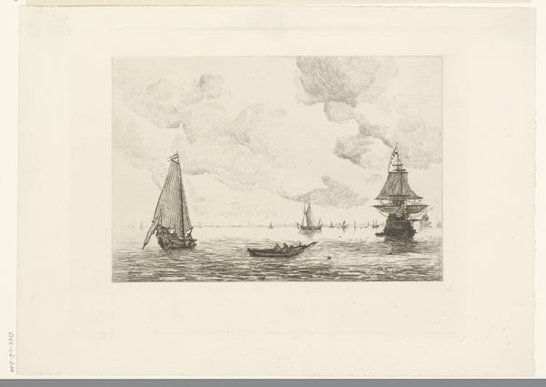 Alphonse Stengelin created this etching, Noordwestenwind op de Merwede, capturing a serene marine scene. Born in the mid-19th century, Stengelin operated within a historical context of significant industrial and social change, where new technologies coexisted with traditional ways of life. His choice to depict sailboats on the Merwede evokes the essential role of waterways in Dutch society, as corridors for trade, transport, and cultural exchange. The sailboats carry the weight of maritime history, reflecting the identity and labor of those who depend on the water for their livelihoods. The artist's hand delicately renders the wind's influence on the sails and water. There is an emotional undercurrent to the image, a sense of connection to nature. In a rapidly industrializing world, this work encapsulates the enduring relationship between humanity and the natural environment, reminding us of the timeless beauty and power of the sea.