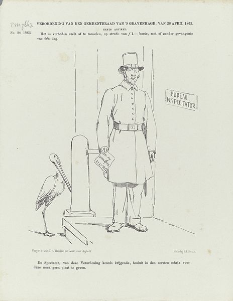 Editor: Here we have “Hinderlaag in Duitsland,” created sometime between 1900 and 1940, using pen and ink. It feels almost like a political cartoon. What stands out to me is how stark the composition is, dividing the image into two distinct sides with contrasting figures. How do you interpret this work? Curator: The division is indeed striking. Observe how the artist employs contrasting textures and line weights to differentiate the figures. The left figure, rendered with relatively clean, unbroken lines, appears detached and observant. In contrast, the figures on the right are enveloped in dense hatching, creating a sense of confinement and shadow. Note, also, the subtle distortion of perspective, creating visual unease. What is the effect of this stylistic choice? Editor: I guess that distortion and those harsh lines on the right amplify the tension, as though something is lurking just out of sight. Do you think the artist had a specific message in mind? Curator: The precise narrative is elusive. The figures, however, seem symbolic. The man on the left, detached and perhaps civilian, stands in stark opposition to the ominous soldiers in the shadows on the right. There is a contrast in presentation, is there not? Do you agree with this visual opposition? Editor: Yes, I see it too! It makes me think about societal divisions, about those in power versus those outside of it. I initially saw it as a basic cartoon, but analyzing the artistic choices reveals more layers. Curator: Precisely. The beauty lies not only in the immediate impact but also in decoding the language of the artwork. Visual language such as texture and the division in this piece are key in interpreting it. Editor: It's fascinating how formal elements alone can convey such complex ideas. Thanks, that was incredibly insightful! Curator: My pleasure.