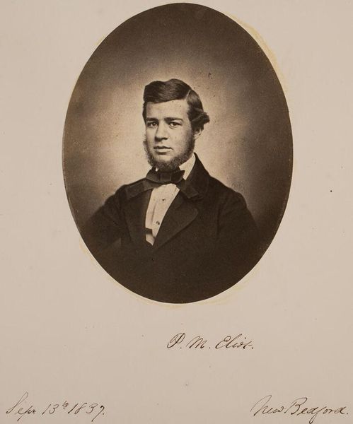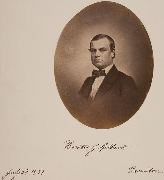 Curator: We're looking at John Adams Whipple's portrait of William Henry Fox, taken around 1857. The image itself is relatively small, but the mount suggests a presentation piece. Editor: There's a certain somberness to it, wouldn't you say? A sense of formality, but also vulnerability in his eyes. Curator: Yes, and Whipple was a pioneer of early American photography, experimenting with daguerreotypes and other innovative processes. The materiality of the image itself, the metallic sheen if you were seeing it in person, speaks to the labor involved in image-making at that time. Editor: The bow tie and the dark coat evoke a sense of social standing, don’t they? It's a carefully constructed image, projecting a specific identity. The oval shape frames him almost like a cameo. Curator: Right, this was at a time when photographic portraits were becoming increasingly accessible, but still carried a certain weight. It's important to consider the context of production and consumption of images like these. Editor: I agree. It's a window into a specific time, a specific person, captured through the lens of symbol and self-presentation. Curator: Thinking about the materials and labor helps to demystify the artistic process. Editor: And thinking about the symbolism helps us understand the man.