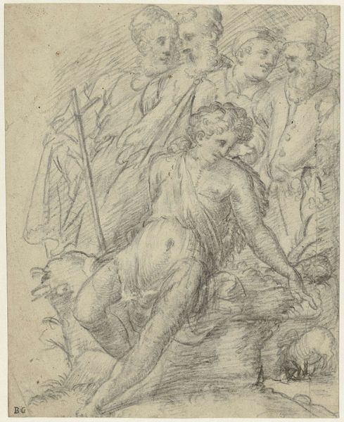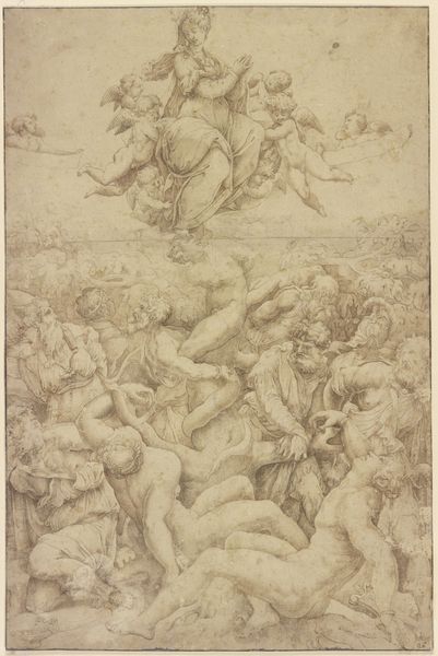 Curator: Good morning! Today we are looking at an ink drawing by Giuseppe Diamantini, a Baroque-era piece titled "Allegory with Mythological Figures," dating from around 1650 to 1705. What catches your eye? Editor: It's intensely classical. All these figures languidly reclining… I'm immediately reminded of a fever dream – like one of those hazy recollections of Renaissance paintings that swim up when you’re ill. It feels almost theatrical, or even hallucinatory! Curator: Hallucinatory...interesting choice of words. Tell me more! Editor: It’s the ethereal quality. The figures blend; it's dreamlike and not entirely grounded. Plus, with allegory and mythology hand-in-hand here, there's a dense symbolic load to unpack. Each figure a potential layer of meaning. It’s potent. And, oh! I spot a rather curious goat-like creature snuggled near the reclined figure. What could it be whispering? Curator: Baroque art did have that inclination to layered, sometimes deliberately obscured symbolism. Diamantini's allegory, composed with such pen and ink, echoes the period’s theatrical flair and classical learnings, while those figures do appear caught in a suspended narrative—ambiguous, certainly inviting multiple readings. The goat might echo the idea of fertility but within an ambiguous context that isn’t clearly joyous. Editor: Absolutely. It’s both alluring and slightly unsettling. Speaking of layers, the density of linework also enhances this complexity. Diamantini has crafted a visual puzzle. There's so much swirling, interwoven, that clarity surrenders to something more evocative and unsettling, particularly those divine, perhaps judgmental figures gazing down. It’s quite a captivating, slightly eerie experience, no? Curator: It is. We both find our particular fascination with those themes present within it. It speaks to our enduring desire to both interpret stories and create new ones, blurring myth with emotional resonance, isn’t it? Editor: I agree entirely, it truly invites endless dialogues, both internal and external, doesn’t it?