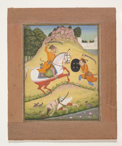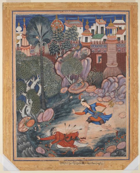 Curator: This watercolor, "A Muslim Pilgrim Learns a Lesson in Piety from a Brahman," is from a Khamsa, or Quintet, of Amir Khusrau Dihlavi and was created between 1572 and 1623. The manuscript page is currently held at the Metropolitan Museum of Art. What strikes you first? Editor: I'm struck by the layered narrative, and that the landscape is almost character in itself, informing the relationships and morals at play here. The figures, rendered with soft watercolor, feel integrated with the overall materiality of the scene. Curator: Yes, notice how the earthly tones – ochre, umber, sienna – they dictate the emotional temperature. I am intrigued by the clear delineation between the spiritual seeker – the Muslim pilgrim carrying his water, contrasted to the Brahman appearing to perform ritual cleansing through water or possibly being purified by some ritual. Do you see an established canon being addressed here? Editor: Certainly, water symbolism, and ideas of ritual cleansing pervade many belief systems. The clothing itself carries meaning; the simplicity of the pilgrim's garb juxtaposed against the more elaborate fabrics, which likely indicate his status as someone participating in a sacred ritual. These visual cues of difference serve the overall narrative in this single panel. It reminds me how key material signifiers become within a hierarchical framework. Curator: I would further note the cave in the corner of the scene and what that represents for both religious figures, and humankind, namely their understanding of earthly knowledge and their pursuit of the divine in landscape – it ties into notions of devotion to land and pilgrimage across Persia. It appears to challenge, gently, who can claim more "authentic" piety in society. Editor: It's intriguing how such profound concepts – devotion, ritual, belief – are rendered with these light, flowing watercolors. The tangible becomes ethereal. The method reinforces the content so thoroughly, suggesting not a contest between religions, but shared aspects in their spiritual expression within earthly constraints and conditions. Curator: It provides great food for thought. Thank you for offering an additional dimension to this painting. Editor: And thank you.