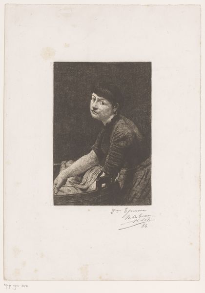 Curator: The somber tonality certainly establishes a mood, doesn't it? A profound quietude or subdued acceptance of a timeless human burden comes to mind. Editor: Precisely. This etching, crafted in 1884 by Henri De Graer, is titled "Vrouw bij een wastobbe"—"Woman at a Washing Tub". Note how the realism he embraces isn’t mere reproduction, but rather a structural contemplation on light and shadow. Observe the meticulous etching lines forming and deforming the figure, her presence arising organically. Curator: The tub as a symbol...of course, a classic representation of domestic labor, tied deeply to notions of purity, cleansing—almost ritualistic, yet also representing hardship, ceaseless toil. What could be seen, perhaps cynically, as women’s plight in turn of the century domesticity? Editor: An insightful point, and it extends further than you might think. The formal placement, note how the washing tub isn't presented in an abject light. The square in the composition adds an essence of dignity or simple respect to her daily work, rather than just presenting hardship. Her direct, confident gaze challenges sentimentality or pity. It is about simple reality in which both her agency and the subject’s essence in being, stand central. Curator: Her clothes speak to practicality rather than comfort—simple shapes without affectation. Also, those sharp, strong lines emphasize the texture of the fabric, even the way light catches them seems intentionally unromantic. It directs us from the figure’s expression. Editor: Indeed. We are experiencing Realism distilled to its core: existence depicted plainly through careful study of structural essence via line and tonal rendering. Curator: The gaze then is that of honest regard and strength, in the face of constant hardship. It leaves you admiring not for the woman’s status in being at the washing tub, but at the essence of who she is and that, she does. Editor: Absolutely, and through the material qualities of this etching, De Graer constructs far more than an image—but a profound observation about dignity within labor and living itself.