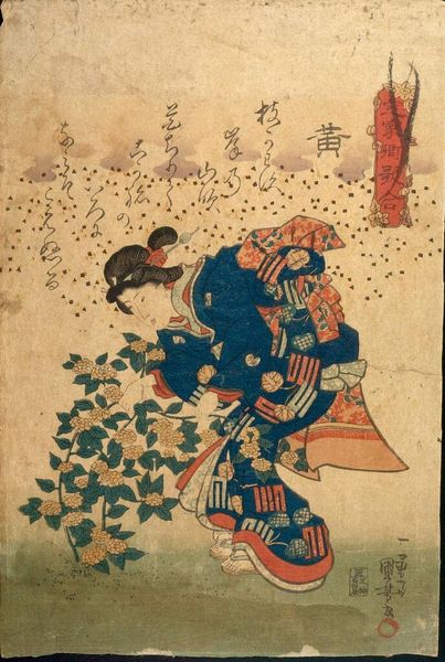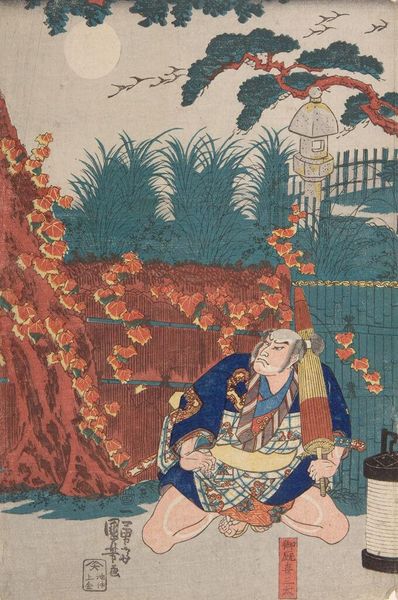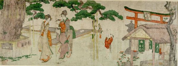 Curator: Let's examine this striking print, "Abalone Divers," attributed to Utagawa Kunitora, who lived from 1804 to 1844. The work presents a scene of labor and leisure. Editor: It feels so relaxed, doesn't it? The soft colors and the way the figures are arranged create a really peaceful vibe, even with the divers at work. Curator: Indeed. Note the strategic use of color blocks to delineate forms. The red horizon line, for example, creates a distinct compositional division. Editor: I love how Kunitora captured that moment of pause, the women resting on the shore, almost like a painting of everyday poetry. Curator: The composition invites us to contemplate the subtle interplay between human activity and the natural world, a recurring theme in ukiyo-e. Editor: Thinking about the divers, I wonder about their stories, the cold water, and the precious abalone, it makes you appreciate this glimpse into another life. Curator: Precisely. Kunitora offers not just an image, but a window into the social and economic realities of his time, rendered with remarkable artistry. Editor: Definitely leaves you pondering the connection between work, rest, and the vastness of the sea.