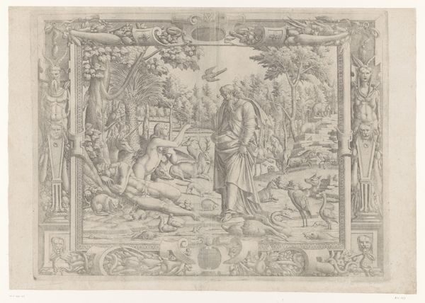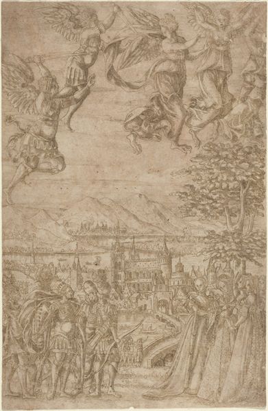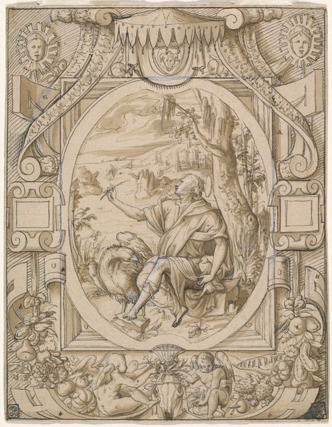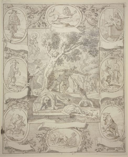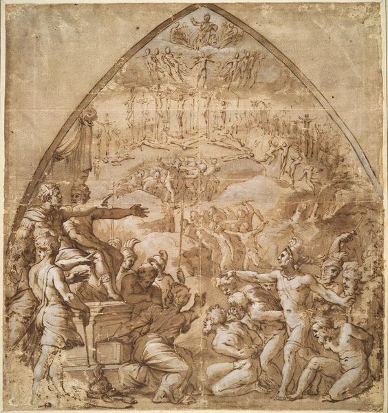 Editor: Here we have "Design for a Stained Glass Window with the Story of Aaron" by Jean Cousin the Younger. It's undated, but the materials are pen and ink with charcoal on paper. It strikes me as incredibly detailed and complex, almost like a graphic novel within a stained-glass format. What stands out to you about this design? Curator: Well, considering the materials, it is fascinating to consider the labor involved in its production. Imagine the hours spent rendering each figure, each architectural detail. Think about the production of the paper itself. Also, let's think about what materials were available to the artist during this time, and where they came from. And the planned function of this design – for a stained glass window. Glass, pigment, and the labor of creating stained glass during the time was a luxury that suggests the affluence of its commissioner. Who would be consuming this? Editor: So you’re highlighting the economic aspects tied to its creation, contrasting the artistry with the materials' value and accessibility? Curator: Precisely. We can ask what narratives of power and social structure are embedded within this stained-glass window's very materials and the process of its making. Are we meant to appreciate the biblical story or perhaps something more? Editor: It’s a new way to see it, considering how the material choices and their historical context add another layer to the narrative being portrayed. Curator: Right. It compels us to investigate the socio-economic forces that shaped its production. That includes challenging any supposed divide between high art and skilled craft. Editor: I never really considered stained glass from that point of view, thank you! It really provides some context. Curator: Absolutely. These sorts of objects encourage an appreciation for materiality and labor which adds dimensions beyond its aesthetic qualities.
