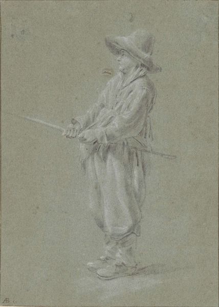 Johan Daniël Koelman created this pencil drawing titled Studie van een staande jongen met een stok en een hoed, or Study of a standing boy with a stick and a hat, during the mid-19th century. Koelman, who died young, captures a slice of Dutch rural life that resonates with the social and economic realities of the time. The drawing encapsulates the identity of youth intertwined with labor. The boy's simple attire and wooden shoes suggest a working-class background, while the hat and stick hint at his role, perhaps herding animals. There's a sense of quiet resilience in his stance, a testament to the experiences that shape the lives of children within the working class. While the drawing appears traditional, it also develops a narrative about childhood that moves beyond simple stereotypes. It's an intimate study, revealing the humanity and quiet dignity of the boy. It encourages us to consider the intersections of age, class, and labor, reflecting the lived experiences of people often overlooked in grand historical narratives.