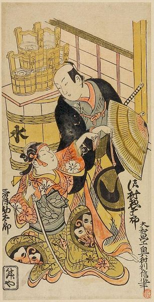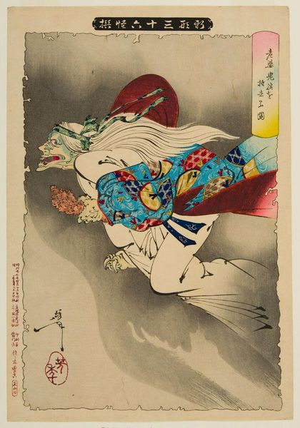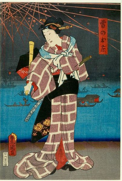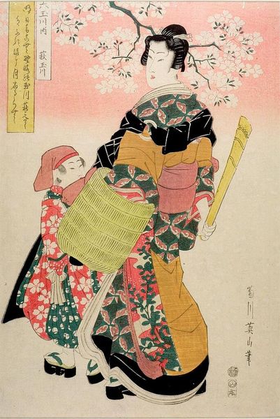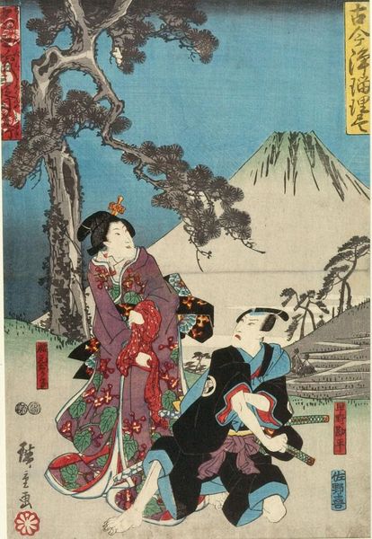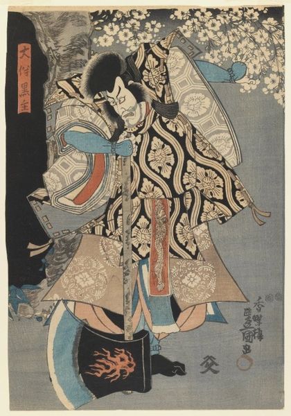 Editor: This woodblock print by Utagawa Hiroshige, titled "The Spirit of the Komachi Cherry Tree and Åtomo no Kuronushi," has such a striking contrast between the delicate blossoms and the laborer with his axe. What can you tell me about it? Curator: Notice how the woodblock medium itself dictates the aesthetic. The flat planes of color, the sharp lines, and the layering of prints all speak to a production process dependent on skilled labor and the availability of specific materials. Editor: So, the art is a product of its making? Curator: Precisely. The image is not just a representation of a play, but an artifact of a specific socio-economic context, where art production was intertwined with craft and commerce. Editor: That connection between the artistic process and its historical context makes me see it in a new light! Curator: Indeed. By examining the labor and materials, we get a richer understanding.