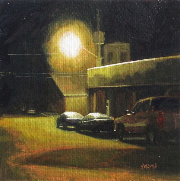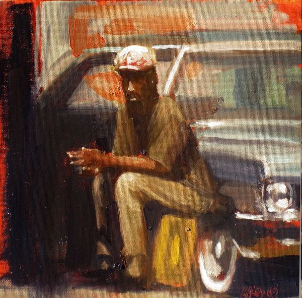 Editor: This is "summer sun" by Joseph Lorusso, an oil painting showing two men casually posed by some classic cars. It feels like a still from a movie, maybe a nostalgic one. What kind of stories do you see in it? Curator: This piece speaks to me about representation and the construction of masculinity, especially working-class masculinity, within American visual culture. Think about the cars themselves, these relics of a bygone industrial era. They’re not just objects; they're symbols of status, of mobility, and a certain kind of rugged independence often associated with men. Editor: So you’re saying the cars contribute to how the men are perceived? Curator: Absolutely. Consider how the figures are positioned – one leaning against a truck, the other with crossed arms, exuding a sense of ownership or belonging. Their body language tells us a lot about their relationship to this space and to each other. Do you get a sense of who might hold more power? Who might be looking, and who is being looked at? Editor: I see what you mean. One seems more dominant, perhaps? Does the title play into this at all? “summer sun”… is that just a descriptor, or something more? Curator: "summer sun" evokes ideas of leisure, but also heat and perhaps labor. How does the artist portray labor – or lack thereof? It's easy to fall into idealization of past eras, but important to look closer at the cultural contexts that elevate some while oppressing others. Editor: That’s a lot to think about! I never considered how even something seemingly straightforward, like a genre scene, could be so deeply intertwined with social power dynamics. Curator: Precisely. Art like this compels us to investigate whose stories get told, and how, challenging the status quo and opening new avenues for interpretation.