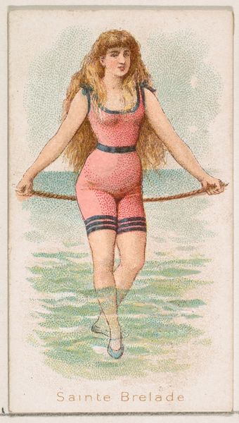 Curator: Ah, "Sainte Brelade, from the Beautiful Bathers series," created in 1889 by Wm. S. Kimball & Co. The medium includes drawing, colored pencil, and print techniques, residing now at The Metropolitan Museum of Art. Quite the charming piece! Editor: Charming is one word for it. My first thought? A curious mix of vulnerability and, well, blatant marketing. It has a sort of candy-coated feeling about it. Curator: Marketing, absolutely. These were trading cards included in cigarette packs, hence the company’s name. But the vulnerability, I see it too. There's a delicate use of colored pencil here. Notice how the artist renders her skin tones with gentle stippling, almost pointillist. The soft blues and greens create a dreamlike setting around her. Editor: Dreamlike, or a little too saccharine? I’m snagged on the Ukiyo-e vibe mixed with Impressionistic brushstrokes and, ultimately, a portrait that seems more caricature than character study. There is a real tension between its artistic aspirations and its purpose as advertising. Curator: That tension, for me, is its appeal! Kimball & Co. were attempting to elevate their brand, associating it with art and beauty, a savvy move. The composition, though seemingly simple, draws the eye directly to her. Her slight smile, her poise… it’s an idealized vision of femininity. Also the theme reminds us that we are seeing the origin of gender marketing at work. Editor: Yes, that's all very present but… Her costume feels somewhat restricting, especially around the legs, which brings attention to body image and perception, topics that stay ever-present! But look at those socks – how modern this feels. Curator: It's funny how fashion and its implications resonate across time, isn’t it? Perhaps that's what makes this piece endure. A combination of artistry, marketing ingenuity, and timeless themes about beauty and commerce. Editor: So, is Sainte Brelade simply selling cigarettes or offering us a glimpse into late 19th-century ideals? It's all deliciously interwoven, isn't it? The push and pull fascinate me.