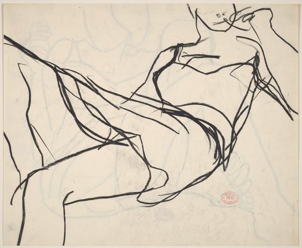 This is an ink drawing on paper by Richard Diebenkorn, titled "Untitled [reclining female nude with back to wall and leg raised]". The subject of the drawing is immediately recognizable, but what is significant here is Diebenkorn's abstraction of the human form through a network of bold lines and varied textures. Note how the network of lines renders the shape of the body, yet simultaneously breaks it down into abstract components. The stark contrast of the black ink against the white paper generates a dynamic visual rhythm, guiding the viewer's eye across the composition. Notice how this interplay of positive and negative space challenges traditional representations of the nude by focusing on the formal relationships between line, shape, and space. The reclining figure is not merely an aesthetic object but an exploration of the language of drawing itself. The sketch destabilizes established meanings of figurative art, by engaging with new ways of thinking about representation.