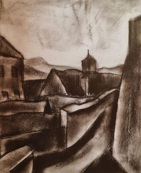 Editor: So, this charcoal drawing is called "Czobel Lappang…" by Bela Czobel. It’s a landscape, and honestly, it kind of feels like a dream, maybe a slightly unsettling one? All those soft grays... What stands out to you? Curator: It does have that dreamlike quality, doesn’t it? For me, the drawing feels almost like a memory struggling to surface. Look at the way Czobel uses the charcoal; it’s so evocative. The lack of sharp lines almost suggests the blurring of time and place. Do you sense a kind of anxious energy? Editor: I do, especially in the contrast between the lighter sky and the darker buildings. But where does that come from, do you think? Curator: Well, think about the context. Czobel was part of the German Expressionist movement. They were really interested in expressing inner emotional states rather than depicting the world realistically. This landscape isn't just a place; it’s a state of mind. Is it a comfortable place to dwell in? Editor: No, not really. It’s… interesting. But there's a heaviness, like something's just out of reach. Curator: Exactly! The expressionists embraced that ambiguity. What’s beautiful about this is it encourages us to explore our own emotional responses to the scene. It begs the question: what unsettled feelings are the buildings hiding? Editor: That makes me look at it differently, I was mostly thinking about the greyscale values, but you’re right, the scene becomes far more haunting, almost ominous! Curator: And that's the magic of art, isn't it? It starts a conversation, first with the artist and then, hopefully, with ourselves. Thanks for the nudge to spend some time reflecting on Bela Czobel. Editor: Thanks for lending me a hand in this journey! This piece is definitely more complex than I thought!