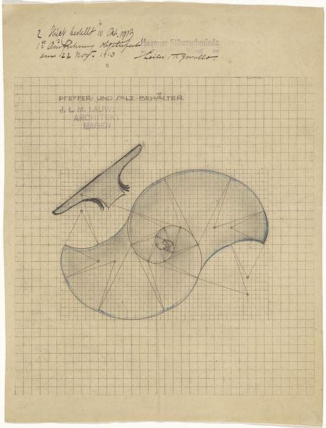 Editor: We’re looking at Mathieu Lauweriks’s "Design for a Shoe Buckle" from 1913, an ink drawing on paper. The geometric forms sketched here feel so precise, yet there's something organic about them too. I’m curious, what do you see in this piece? Curator: What immediately strikes me is the interplay between ornament and industry that’s characteristic of the period. Shoe buckles, once markers of status and intricate displays of craftsmanship, are now being approached with an eye towards mass production and the streamlining influence of geometric abstraction. Notice how the design almost resembles stylized machine parts. How might the shift towards industrial manufacturing affect the status of artisans like Lauweriks? Editor: So, this design reflects anxieties about industrialization creeping into decorative arts? The organic forms still remind me of Art Nouveau. Curator: Precisely! He’s referencing Art Nouveau while simultaneously responding to a world demanding efficiency and standardization. This tension is where we see the push and pull of artistic identity against prevailing socioeconomic winds. It suggests how design itself was becoming a battleground for ideas about labor, value, and the role of art in society. Considering that Lauweriks was involved with the Dutch Theosophical Society, do you think these shapes reference something larger than purely aesthetic concerns? Editor: It’s interesting to consider the Theosophical influence... I wonder if the geometric structure symbolizes a spiritual framework beneath the surface. Curator: Indeed. By viewing the piece as more than just a design sketch but also a reflection of the cultural and spiritual climate, we start to uncover its deeper significance. Art isn't created in a vacuum, and Lauweriks gives a glimpse into the shifting perspectives of early 20th-century design. Editor: I definitely see the struggle now, the balance between handcrafted artistry and the encroaching industrial age, especially in something as small as a shoe buckle. Curator: And seeing it on the grid, you get a glimpse into how this drawing would come to life through standardization, which tells a huge story about shifting values.