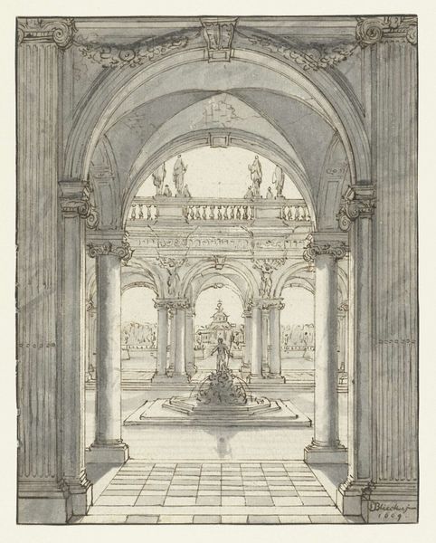 Editor: So, this is “De Hofzaal, toneeldecor” by Georges François Blondel, created in 1763. It's a drawing and watercolor, and what strikes me most is the immense scale suggested by the architecture compared to the tiny figures. What can you tell me about it? Curator: Well, it's fascinating to consider this stage design within its historical context. The Baroque period, though waning, was still clinging to power, and what better way to exhibit supremacy than architecture that dwarfed its inhabitants. We are meant to feel insignificant against the backdrop of the monarchy. How does this resonate with contemporary perspectives on power and space, particularly for marginalized groups? Editor: That’s a powerful way to look at it. It almost feels oppressive. Do you think the artist intended that? Curator: Blondel wasn’t merely constructing pretty pictures. These images shaped public imagination. Who does that grand hall truly serve? It’s a stage for the elite, subtly excluding others. Considering who is given space and visibility is essential, especially when examining historical depictions like these. What statements does that architecture make about inclusion or exclusion, belonging or alienation? Editor: So the artwork is more than just aesthetic. It’s making a statement about social hierarchy. The perspective really drives home that sense of looking up, of feeling small in this grand hall. Curator: Exactly! Now, let's think about how we, as viewers, engage with this image today. What do we inherit from these visual constructions of power? Editor: I see now. I had only thought about the technical skill, the perspective, the details... Curator: And now you’re looking through the social implications! It’s about constantly questioning who is being represented and why, isn’t it? Editor: Definitely something I'll keep in mind going forward. Thanks so much for this insight!