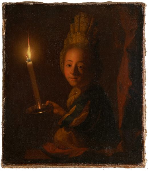 Curator: Here we have Johann Conrad Seekatz’s oil on canvas from about 1760, entitled "Girl with a Burning Torch." Editor: The immediacy is striking. It’s like peering into a shadowy corner and catching a fleeting glimpse, that single flame creating a dramatic focal point. Curator: Indeed. The tenebrism, the sharp contrast between light and dark, structures our entire visual experience. Observe how the artist carefully models the girl’s face and hands, using the torchlight to define their contours and to accentuate the geometry. Editor: Light as both illumination and symbol. The torch, carried by a child, recalls classical allegories—Hope perhaps, or the fleeting nature of life. It’s a potent image, connecting personal innocence with larger cultural ideas of transience and memory. Curator: And consider how Seekatz uses complementary colors – the warm oranges and yellows of the flame against the cool browns and blacks of the background. It heightens the dynamism of the composition. Editor: I wonder about the social context. Children holding flames – an echo of ancient rituals, or even something as simple as lighting the way. How does this small moment tie into larger narratives of the 18th century? The fragility of childhood juxtaposed against a symbol of… what, defiance? Knowledge? Curator: You bring up crucial points. I appreciate, too, how the artist directs the gaze; from the flame upward towards the girl’s slightly parted lips and attentive eyes. It creates a compositional rhythm from the material to the internal world. Editor: Right. The narrative unfolds in her expression, drawing the viewer into a private moment of concentrated light amid overwhelming darkness. She's not merely holding a torch, she’s… tending to something essential. Curator: Ultimately, the strength of Seekatz's painting lies in how a few calculated forms establish depth and meaning. Editor: For me, the work’s magic rests in its capacity to invoke myth while staying deeply rooted in the everyday, whispering secrets from another century through the most fundamental elements of light and shadow.