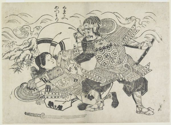 Curator: The first thing that strikes me is the dynamism despite the seemingly simple monochrome palette. It’s a very lively scene. Editor: Indeed! What you’re looking at is titled "Teika's Journey," made by Okumura Masanobu around 1705-1706. It's a woodblock print on paper, currently held at the Art Institute of Chicago. Ukiyo-e prints like this one played a key role in disseminating images and stories to a wider audience. The choice of woodblock print here speaks to the rise of a new consumer culture, art became less about individual patronage and more about affordability and availability. Curator: The material context really underscores the intention of broader accessibility. I'm particularly interested in how the lines define form; observe the flat planes created by the line work, creating a clear and almost diagrammatic representation. It is amazing to observe that an inexpensive method such as this was applied to bring scenes from famous puppet plays to an expanding audience. Editor: Absolutely. The rise of kabuki and puppet theater influenced printmaking enormously, democratizing representation. This particular print belongs to a series showcasing scenes from Japanese puppet plays—stories that captivated the public. Mass production enabled those who never witnessed these plays, particularly lower social strata, to be exposed to the narrative content of plays and engage with the high art and theatrical productions of their society. Curator: Examining the material tells one side of the story. Let’s not overlook the significance of how this object enters public collections, the institutions such as the Art Institute plays such a powerful role in shaping canons. And what social and economic factors allow us to observe an object such as this today? Editor: Valid point! Art institutions play a central part in creating artistic merit by displaying artwork; moreover, this process creates and upholds political narratives. We cannot ignore the inherent social dynamic within such establishments. Curator: To me, examining this image—taking into account both its material history, origins in mass culture, and the socioeconomic institutions of society in both past and present day—lends greater nuance and complexity. Editor: A thought-provoking angle indeed. Thanks for this fascinating exploration.