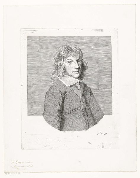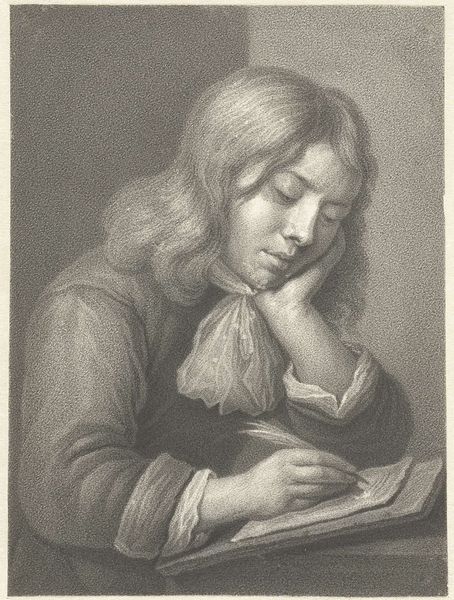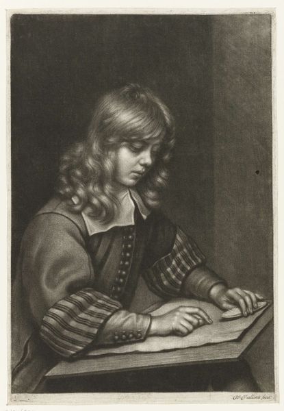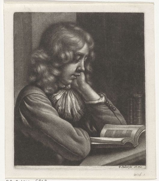 Curator: Here we have "Lezende jongen," or "Reading Boy," an engraving from the Dutch Golden Age currently held here at the Rijksmuseum. Its creation is dated sometime between 1658 and 1750, though its maker is unknown. Editor: The mood is striking. The concentrated gaze, the dramatic shadows. It makes me wonder what type of ink, what type of paper... such a simple scene, but those details are important to evoke those shadows. Curator: Indeed. These genre paintings were significant as they frequently portrayed daily life and thus, often reveal social and cultural nuances of the era, even offering a peek into domestic settings, social standings. We see an intent young man, presumably middle or upper class, as his dress suggests. Editor: That meticulous engraving surely wasn't cheap. Access to materials and the labour invested indicates a patronage system. I wonder, who commissioned this? What function did it serve? A display of affluence, perhaps? Was it a study? I'd bet someone took their time to make the paper smooth too, back then it was really important. Curator: Well, engravings, through their reproducible nature, did more than reflect existing social hierarchies. They played an active role in shaping visual culture and disseminating information, and they could be used to popularize an individual's image. Consider how these types of images influenced perceptions of knowledge and education at that time. Editor: But those fine lines! I want to see the workshop! Engravings like these demonstrate superb craftsmanship and technique. The boy's hair, that lace collar--think of the tools, the skill to get that luminosity. The labour history that remains unseen but tangible within this very piece. Curator: You’re right, analyzing it through this lens gives it another level of significance and it does point us back towards issues surrounding art as labor and commerce. This piece and its ability to circulate shows us how the power of imagery and its production could solidify norms but perhaps challenge them too. Editor: Exactly, now thinking about this Reading Boy from an artisan angle... really enhances what the piece communicates! I wish all pieces could speak so well.