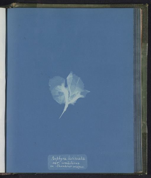Curator: Let’s discuss Anna Atkins’ cyanotype, "Schizonema parasiticum," created between 1843 and 1853. It’s a striking piece in photographic history. Editor: It is. My immediate reaction is one of cool detachment. The stark white against the cyan evokes a scientific illustration, precise yet ethereal. There is something cold about it. Curator: Exactly. The process itself—cyanotype—allowed Atkins, a female botanist, to meticulously document algae specimens. We can see this work, and indeed much of her output, as claiming space within the male-dominated scientific discourse of the Victorian era. Through photography, she constructed a narrative where scientific observation became an act of self-empowerment. Editor: I agree with the historical and socio-political framing. Looking purely at the composition, there is something that is quite elegant: the form of the algae against the monochrome backdrop, an exploration in light and shadow, and her reduction of the subject to its fundamental form, highlighting its delicate structure. Curator: And this choice of subject matter—Schizonema parasiticum—speaks volumes. A parasitic alga. One could read its presence here as a commentary on the parasitic nature of the scientific establishment itself, thriving at the expense of women's contributions. Editor: It’s hard to see that encoded meaning explicitly within this specimen. Isn't it just algae? Is this anachronistic reaching or truly a window into the intent of Anna? What does this image, as a visual phenomenon, do that's uniquely different from text? That's not obvious to me. Curator: We must acknowledge the limitations of accessing the complete intent. The brilliance lies in interpreting its existence, its deliberate placement within the photographic space she created, the claim for space within both artistic and scientific domains, that becomes its feminist statement. Editor: Perhaps. For me, the photograph remains a testament to form. Curator: It’s both. It transcends the binary. Thank you. Editor: Indeed. The dialogue, at least, enriches the perception of it, however contested it might remain.