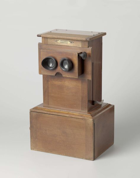 Curator: This is a photograph of a Murphy A146CM wireless console radio, made in 1948 by Murphy Radio Ltd. It's currently part of the collection at the Minneapolis Institute of Art. Editor: My first thought is how wonderfully strange and mute it seems. It’s an almost monolith of wood, interrupted only by a circular, woven-like speaker and those two stark tuning knobs up top. It reminds me of some kind of retrofuturist idol. Curator: Its appeal, as with many modernist designs, lies in the interplay of geometric forms. Note the square cabinet softened by subtle, concave curves, juxtaposed with the perfect circle of the speaker grill. This piece also encapsulates the streamlining aesthetic popular during the mid-20th century, seeking a visual harmony with a very practical use. Editor: I'm seeing echoes of the interwar years here, that Bauhaus practicality dressed in a post-war optimism. It looks sturdy, reassuring. Were I alive at the time, I’d imagine its comforting voice a staple in a very modern living room. Almost human, its voice filling your life. It certainly cuts a compelling profile. Curator: Precisely! It speaks of both the formalist reduction inherent in modern design and the socio-cultural role of mass media in the postwar world. You might even see semiotic signals embedded in the material choices. Editor: I wonder about the particular grain of the wood—it has a life of its own that’s totally divorced from the mechanical components it’s been built to house. If one can hear music through a circular scrim, can’t one listen also to the radio’s box? Hear its past and place? It invites such anthropomorphic considerations, no? Curator: I concur that the textural contrast draws attention. And if we consider Walter Benjamin’s writing on aura in a time of mechanical reproduction, then such visual, and potentially haptic, engagements with material are important as aspects of artistic presentation, yes. Editor: Thinking about the wood grain, those little circles like sound waves growing smaller in time— I imagine a quiet living room, full of gentle voices, static-filled, like ghosts in an electrical purgatory. Thank you for prompting these thoughts, its a marvelous work, on many levels. Curator: Thank you. Its functional minimalism is something to truly admire in itself. I too have found a newfound perspective on what design history can bring.