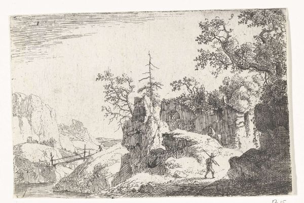 Johannes Glauber made this etching of a rocky ravine sometime between 1661 and 1726. Etching is an intaglio printmaking process that uses acid to cut into a metal plate, here likely copper, to then be inked and printed. The process itself influences the aesthetic of the artwork. Notice the dense pattern of tiny lines, built up through repeated controlled biting of the plate, that creates tone and depth. This linear quality gives the rocks and trees their distinctive character. The fine lines suggest the amount of skilled labor that went into creating the plate. This contrasts with the apparent ruggedness of the depicted landscape, a romantic vision of untamed nature. Etchings like this one, therefore, weren't just about representing a place. They were also about demonstrating the etcher's mastery and about a growing appreciation of the natural world as a subject of artistic and intellectual interest. The artist's skillful work and the scene's rough appearance create a dynamic tension. It reminds us that understanding a work of art involves appreciating both the image and the intricate production processes behind it.