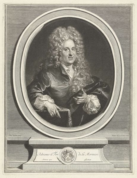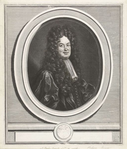 Curator: Up next, we have a particularly striking engraving titled “Portret van Nicolas de Malezieu.” The piece, crafted sometime between 1666 and 1707, is by Gérard Edelinck. Editor: Woah, immediate reaction—that wig. I mean, what a statement. It’s like a cloud of curls, practically swallowing the guy's head. It screams…status. Curator: Precisely. Wigs of this magnitude were potent symbols, signifying wealth, power, and social standing. This portrait, therefore, serves not just as an individual likeness, but as an emblem of Malezieu's societal position, very baroque. Editor: I can almost feel the weight of that wig! Seriously, though, the detail is insane. You can see every single strand of hair, and the texture in the face…it’s remarkable for an engraving. Curator: Absolutely, Edelinck’s skill is undeniable. Note also the oval frame enclosing the portrait. Frames are never simply decorative; they often serve to highlight the subject’s importance or allude to particular philosophical frameworks. Editor: I notice the inscription below—some Latin quote, adding another layer of gravitas. But despite all the pomp, there's a kind of weariness in his eyes, a hint of melancholy maybe? Curator: A keen observation. That subtle vulnerability adds a human dimension to the otherwise stately presentation. It invites contemplation not just on status, but the person beneath the powdered wig. Editor: You know, sometimes I think about the sitters… stuck there for hours, trying to look important, when really, they might have just wanted a cup of tea. It really speaks to how we try to immortalize people. Curator: The image certainly becomes an artifact in itself; these portraits were, and are, powerful memory prompts. Editor: Agreed. It makes you consider, really, how we choose to be remembered. What kind of "portrait" are we creating for ourselves, right now? Curator: Indeed, let’s move onto the next artwork, as it ties interestingly into these themes.