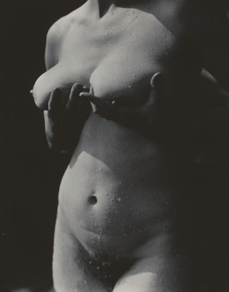 Editor: Here we have Alfred Stieglitz's photograph "Hands and Breasts," taken in 1919. The composition is strikingly intimate, the sepia tones lend a sense of timelessness. What strikes you most about the arrangement of forms in this work? Curator: It is quite compelling. Observe how Stieglitz employs the cropping. It guides our focus, isolating specific shapes and textures. The hands, dramatically lit, create a dynamic interplay with the breasts they embrace. Consider the texture achieved by the pictorialist process, softening the details. Editor: I see what you mean. The hands, in particular, are so prominent and actively framing the breasts. Curator: Precisely. Stieglitz reduces the figure to its essential forms—the curve of the breasts, the angularity of the fingers. There is a tension created by this stark juxtaposition. Does that strike you as intentional? Editor: Yes, the sharp angles of the hands against the soft curves create visual interest. Almost like a study of contrasting forms. I never really appreciated pictorialism. Curator: Consider this work in relation to modernism's broader formal experimentation, which rejected traditional artistic conventions and narrative. Stieglitz here foregrounds pure form, elevating shape, light, and texture over literal representation. Editor: That’s interesting; thinking about it this way gives me a new appreciation for what he's trying to communicate, the visual relationships. Thanks! Curator: Indeed, exploring the interplay of form illuminates this work's true innovation and enduring appeal.