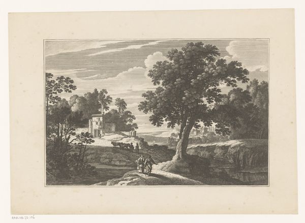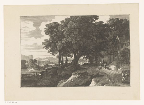 Editor: We're looking at "View of a Mountain near Stuttgart," a 17th-century engraving by an anonymous artist. The scene has a calm, almost pastoral feel despite the intricacy of the engraving technique. The trees dominate the foreground and the little figures going about their day give the artwork a sense of scale. What can you tell me about the piece? Curator: The strength of this print resides within its formal elements. Notice how the artist used line and texture to create a compelling composition? Observe the meticulous hatching and cross-hatching; these techniques model form, create depth and conjure a sense of atmosphere with light and shadow. Editor: So the value lies more in *how* it was created, rather than *what* it depicts? Curator: Precisely. Look closely at the lines creating the foliage, for instance. Each leaf and branch, defined by subtle variations in line weight and density. What effect does that level of detail have on you? Editor: It’s certainly impressive! It's not just a generalized idea of foliage, it really is detailed, lending a realistic feeling to the art. Curator: Indeed. The formal structure emphasizes a balance of light and dark that moves the eye, and the organization of elements, trees in the front leading the eye to Stuttgart on a hill. Editor: I see that now, it feels less random. Focusing on these details really shows the choices and skill involved. Thanks! Curator: My pleasure, a fresh pair of eyes always provides an enlightening viewpoint.