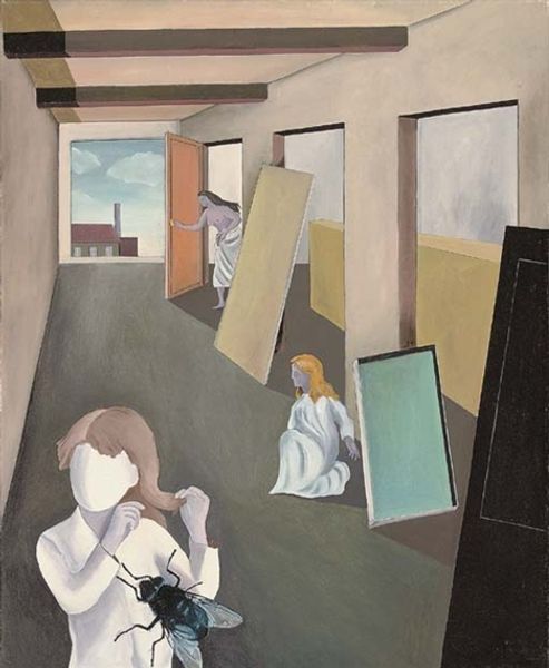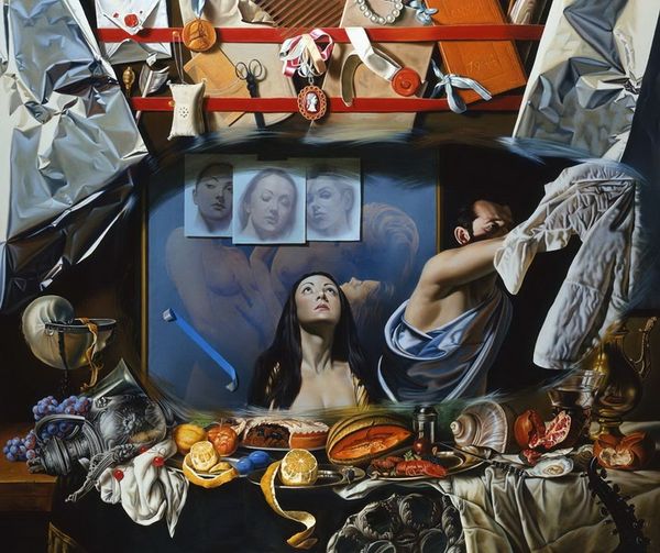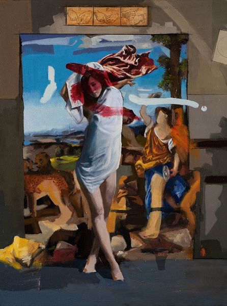Editor: Here we have "How My Paintings Are Actually Made," an oil and acrylic on canvas completed in 2020 by Adam Caldwell. I'm immediately struck by the layered imagery—the painting depicts an artist surrounded by their work, and the paintings within the painting feel simultaneously reverent and vulnerable. What’s your take on it? Curator: Caldwell presents us with not just a portrait, but an active interrogation of artistic labor itself. The means of production are laid bare. We see not just the finished object, but the process – the artist literally surrounded by the fruits and materials of their labor, canvases stacked like inventory. Note the layering of surfaces, the raw canvas texture fighting with smooth portraiture. Editor: It feels almost meta, a painting about painting. Curator: Precisely. And it’s vital to consider the socioeconomic dimensions. Caldwell isn’t presenting some romanticized garret; the scene evokes something closer to a workshop, an enterprise. He's questioning the value judgments we assign to the art object versus the art labor needed for creation. Are these workers presented within a co-op, selling individual portraits from within a larger whole? Are they contracted? Note how these portraits mimic mass produced 'religious icons' and are slightly varied copies from the single original presented within the painting itself. Editor: So, it challenges the preciousness often associated with “fine art?" Curator: Absolutely. Consider the artist’s own labor – the very act of creating this piece, which includes images of mass-produced works! By making "how," we begin to see "why," as it emphasizes artistic creation within specific social and material constraints. The artist asks us to reflect: What truly dictates something as art? And by extension, it requires us to inquire: Who makes that decision, why, and for whom? Editor: I see it now—the focus shifts from admiring the beautiful finished product to contemplating the actual hands and conditions that brought it into existence. Thank you. Curator: It reframes how we consider artmaking and moves it from some innate talent to that of practical skillset; Caldwell's portrait invites introspection not just of artistry but art-economy in total.