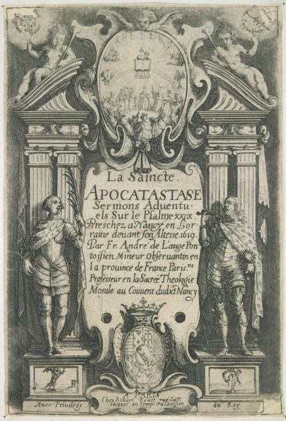 Curator: This is the title page for "Chronique ofte Historische Geschiedenisse van Vrieslant," dating back to 1622 and created by Pieter Feddes van Harlingen. The artwork, a pen and ink drawing, is currently held in the Rijksmuseum. It strikes me immediately as a study in contrasts – a somber but striking blend of text and image. Editor: Indeed! I am struck by how much is happening. From the overall composition, I notice allegorical figures and cityscapes crowded around a central inscription that promises a chronicle of Friesland, starting from the supposed creation of the world until the year 1622. It almost seems a visual assertion of power, truth and legitimacy of historical narration. Curator: Precisely! Let’s consider the materiality and craftsmanship involved. Note the detailed work, typical of engraving, carefully reproducing allegorical and historical themes. Each mark required meticulous work and consideration. What sort of audience would be reading this volume and therefore consuming this kind of visual messaging? Editor: The "privilege" mentioned indicates a level of state sanction involved in producing this historical narrative. So it's tied into Friesland's governing body in the 17th century, framing their region within the broader political landscape of the Dutch Republic and emphasizing their specific identity during a time of enormous shifts in geopolitical influence. Also, who exactly is the author and what are they seeking to establish? Curator: Dr. Pierium Winsemius. The title page explicitly acknowledges the labor and patronage that made the chronicle possible – printing as an industry with specific production methods during its age. But observe, also, the positioning of the allegorical figures; is Libertas to be seen wielding a weapon on behalf of the reader? Does "Historia" carrying all those books weigh down on her stride? Editor: That’s an important point. And what sort of message is presented to the readers through pairing those characters together with the cityscapes? By combining them visually, could van Harlingen be reinforcing ideals of regionalism as a function of history? Or does this layout also appeal to those readers’ senses, reinforcing the cultural norms that may affect their actions in turn? Curator: Well, as always, there’s more than meets the eye with these historical prints. Thanks for opening some of the doors on this unique Friesland record, let's just hope people see beyond just the surface detail as they read. Editor: I completely agree; by teasing apart just one title page, we open a Pandora's box of interconnected histories and socio-political readings!