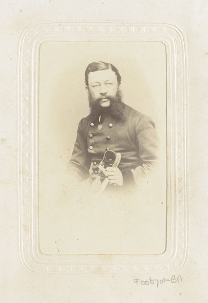 Ernst Ulbrich made this portrait of an unknown man in uniform using photography. The image presents a figure who likely belonged to the military or some form of civic guard, underscored by his stern look and the sword he carries. During the time this image was made, portrait photography served an important social function. It democratized portraiture, providing a means for people outside the aristocracy to represent themselves and their status. Here, the uniform and sword are visual codes that convey authority and service. We should ask: What did it mean to represent oneself in this way? What social values were being promoted? To understand this portrait better, we could look into the history of photography studios like Ulbrich's. It is important to understand their role in shaping public identity. We might also investigate military uniforms of the period, looking for clues about this man’s rank and service. Understanding the social and institutional contexts allows us to interpret the deeper meanings of this image.