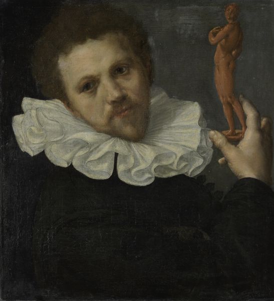 Curator: Looking at this, I immediately feel drawn in by the sheer density of textures, all those earthly colors...it evokes something grounded yet spiritual, like staring into sun-baked clay. Editor: Exactly! What we have here is Juan Bautista Maíno's "Santo Domingo De Guzmán", painted around 1614. The oil on canvas reveals much about artistic production during that period. It hangs today in the Museo del Prado in Madrid. Curator: There's a story being told through the tangible materials, not just symbolism. The careful layering of oils, almost a visible process of devotional labour! He clutches the model church to himself in an odd pose, almost like a reluctant toddler asked to share a favorite toy! Editor: Right, it’s important to consider Maíno's social context too. His position straddling religious and courtly circles informed his work with a distinct interest in realism while idealizing Church power and saintly individuals. He makes very calculated use of precious materials like oil paint to elevate his status in society by the mere expense of this devotional object. Curator: You're completely right; the painting's realism is key. Look at how Santo Domingo is depicted – there’s something profoundly human, almost vulnerable in his expression, yet the looming model of what is almost like an architectural plaything still conveys this overwhelming authority and architectural force, all presented with meticulous artistry. I get this curious feeling like I'm in an illusion: he's so human, and I can imagine smelling and touching the earth with this saint but also feel him looming over my world! Editor: Indeed, and I believe Maíno emphasizes materials to speak to audiences about social order and labor through visual rhetoric: He presents Domingo as both visionary and architect, crafting his influence both literally, holding this object, but also abstractly with this almost godlike architectural presence. And if we examine the craftsmanship and patronage behind such baroque portraits, questions arise concerning the commodification of faith and the material means of achieving it in early modern society. Curator: Mmm, the piece lingers in the mind in ways I hadn't quite expected, a compelling image that challenges conventions as it elevates them. Editor: Well said! For me, examining "Santo Domingo De Guzmán" reaffirms that we cannot understand history or devotion without studying how it was produced through art in paint, labor, and social influence.