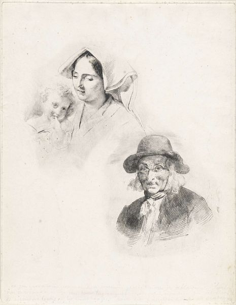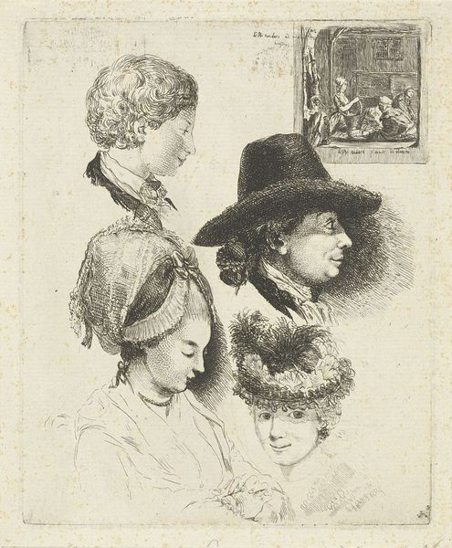 Christiaan Wilhelmus Moorrees created this study sheet with six busts through etching, sometime in the first half of the 19th century. Study sheets like this one reflect the institutional structures of art education in Europe. The Dutch artist Moorrees likely produced this for academic purposes, perhaps for use in a classroom. The sheet presents a range of figural studies after other artworks. The figures' costumes represent different historical periods. This shows the influence of academic tradition, which emphasized the importance of studying and copying the works of earlier masters. The formal exercise of copying and variation had implications for artistic value. Art academies sought to establish a hierarchy of genres, with history painting at the top. This print gives us insight into the way artistic skill was cultivated and how historical styles were transmitted. To understand this study sheet more fully, we might consult archival records, such as the syllabi of art academies and collections of model books used for instruction. Examining the social and institutional context of its creation sheds light on the meanings it held for its creator and the artistic community of the time.