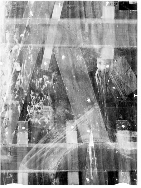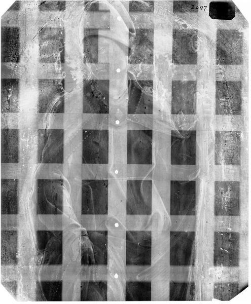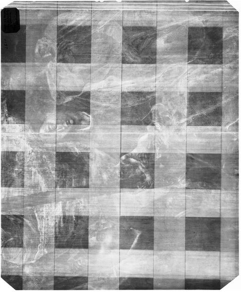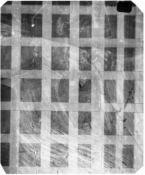 Curator: This is an x-radiograph of "Adoration of Kings," a painting by Cosmè Tura, currently held at the Harvard Art Museums. What are your initial thoughts? Editor: It’s eerie, like looking at a ghost. The stark black and white reveals hidden layers, but the grid imposed on the surface gives it an oddly clinical feel. Curator: Precisely. X-radiography allows us to see beyond the surface, analyzing the artist's technique, revealing underdrawings or alterations made during the painting process. It's a dialogue between art and science. Editor: Right, you can almost feel the history of labor, the density of the materials layered upon one another. Were they trying to identify specific pigments or structural repairs? Curator: Most likely, yes. These images give us a glimpse into the conservation process and the layers of cultural investment in artworks over time. Editor: Seeing it like this makes me consider the painting as an object, subject to the same scrutiny as any other artifact—which is strangely compelling. Curator: Indeed, it offers a unique perspective on the lifespan and evolving significance of a work of art.